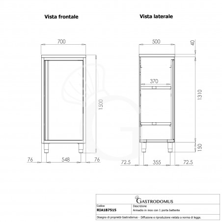 Edelstahlschrank, 1 Flügeltür, 2 Zwischenböden, B 700 mm x T 500 mm x H 1500 mm
