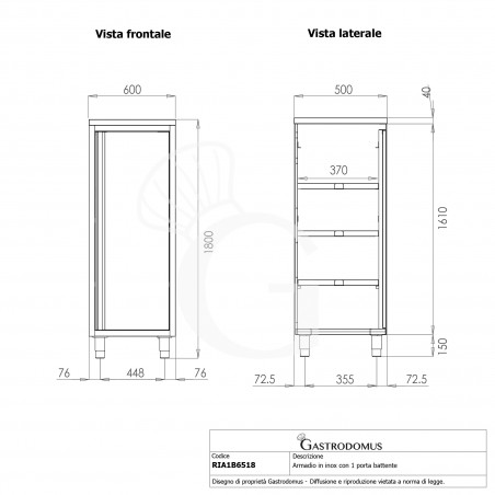 Edelstahl Hochschrank, 1 Flügeltür, 3 Einlegeböden, B 600 mm x T 500 mm x H 1800 mm