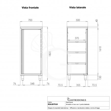 Edelstahl Hochschrank, 1 Flügeltür, 3 Einlegeböden, B 700 mm x T 500 mm x H 1800 mm
