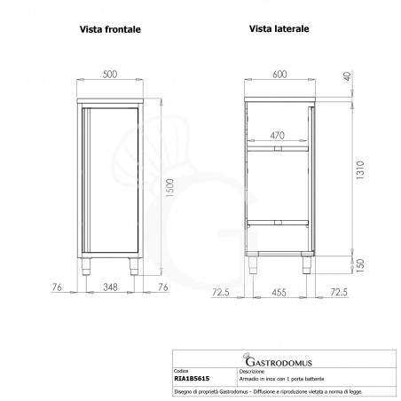 Edelstahlschrank, 1 Flügeltür, 2 Zwischenböden, B 500 mm x T 600 mm x H 1500 mm