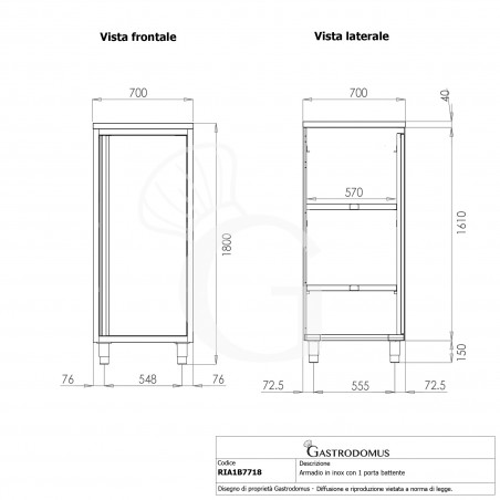 Edelstahl Hochschrank, 1 Flügeltür, 3 Einlegeböden, B 700 mm x T 700 mm x H 1800 mm