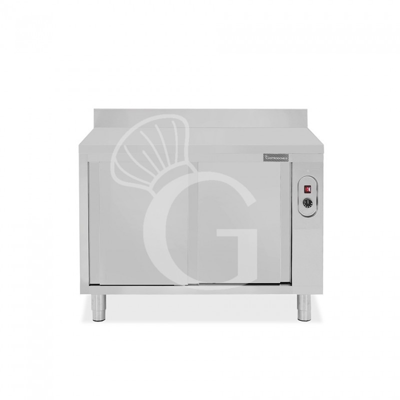 Beheizte Tisch aus Edelstahl mit Schiebetüren und Aufsatz, Breite 1000 mm x Tiefe 600 mm x Höhe 950 mm.