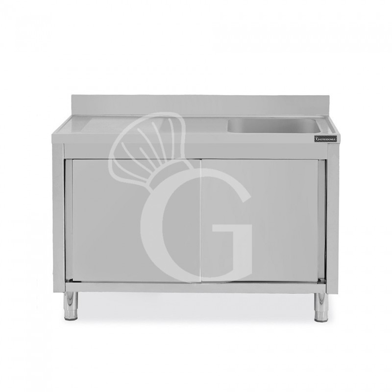 Spülschrank, Edelstahl, Abtropffläche links, Schiebetüren, 1 Becken, Aufkantung, B 1400 mm x T 700 mm x H 950 mm