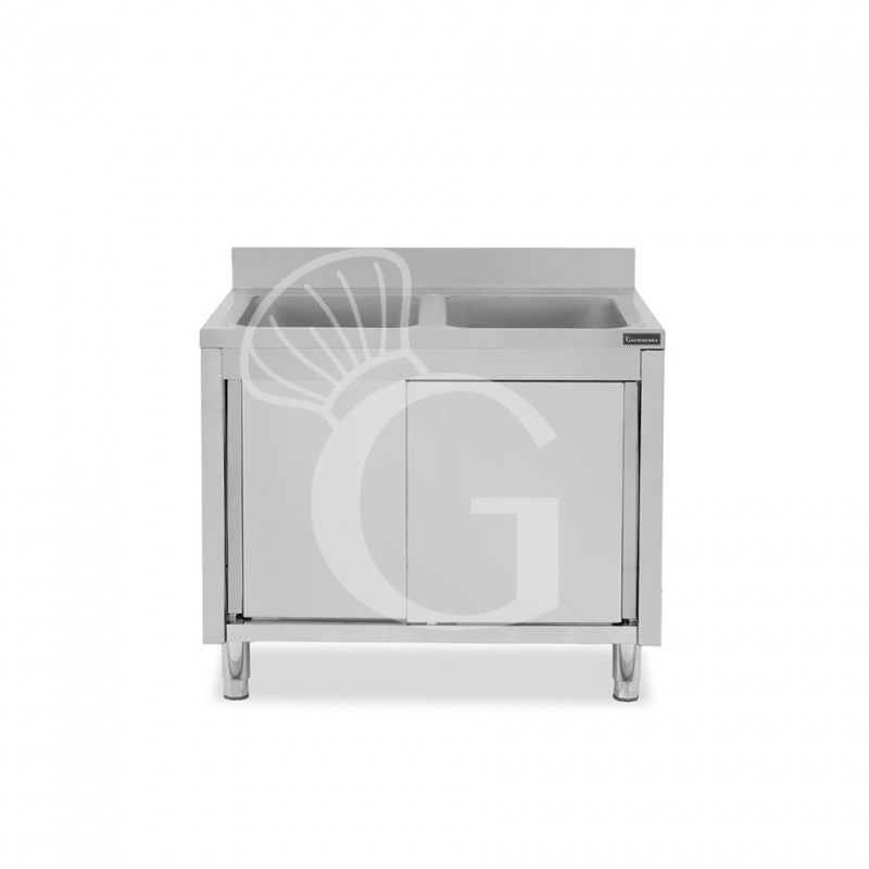 Topf-Spülschrank, Edelstahl, Schiebetüren, 2 Becken, Aufkantung, B 1000 mm x T 600 mm x H 950 mm