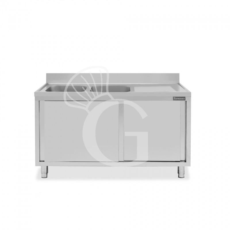 Spülschrank, Edelstahl, Abtropffläche rechts, Schiebetüren, 2 Becken, Aufkantung, B 1400 mm x T 700 mm x H 950 mm